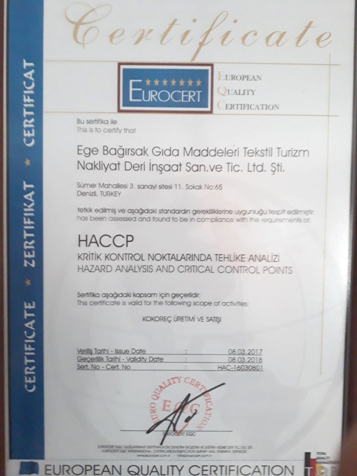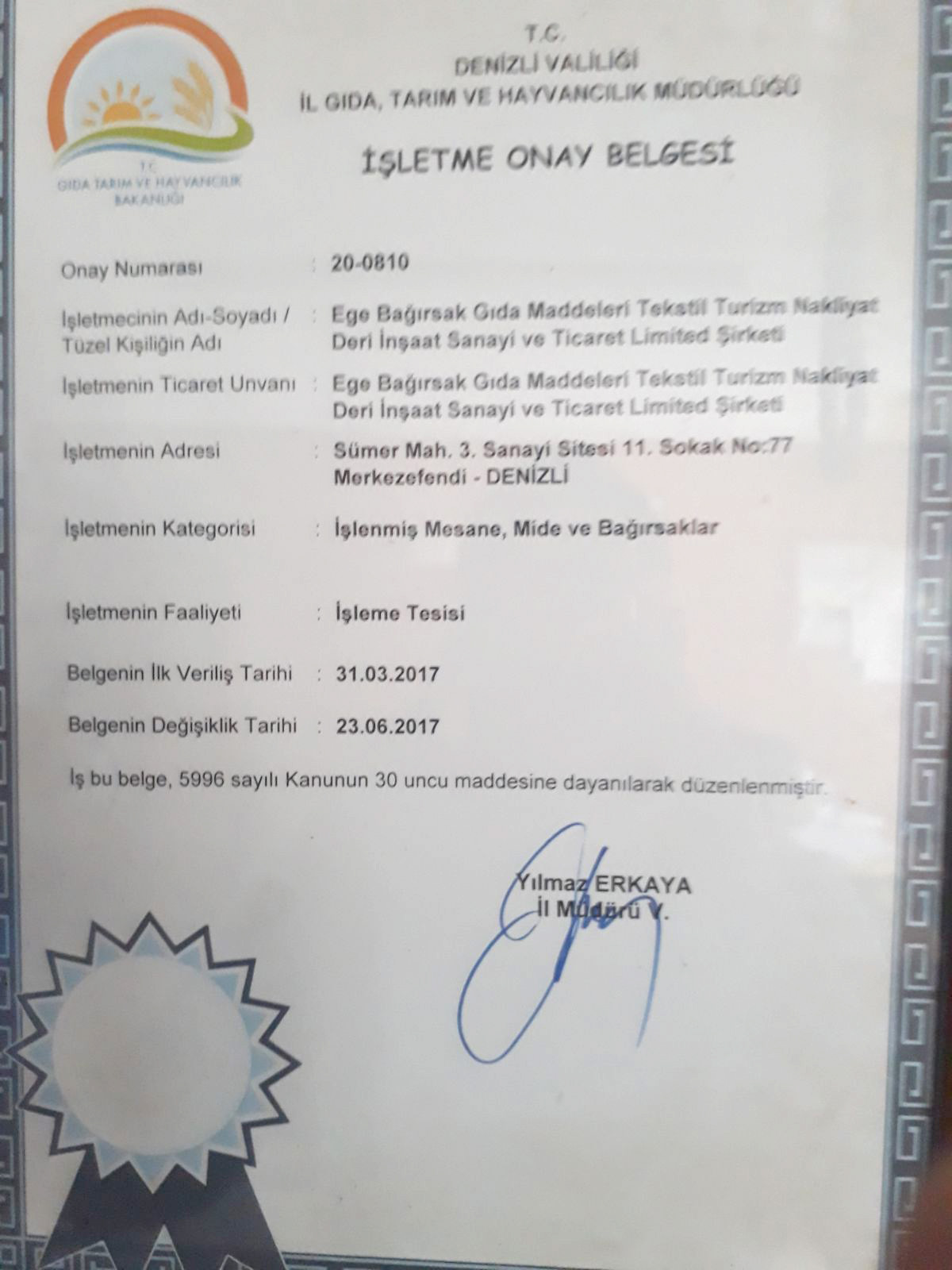Tesisimizde üretilen bütün ürünler mezbahalarda veteriner kontrolünde kesimi yapılan küçük baş ve büyük baş hayvanların günlük olarak temizlenen bağırsakların bünyemizde bulunan veteriner kontrolünden geçtikten ve onay aldıktan sonra üretim yapılmaktadır. Tesisimizde gerçekleşen bütün üretim, parçalama, pişirilme ve paketleme aşamaları tamamen veteriner kontrolünde yapılmaktadır.